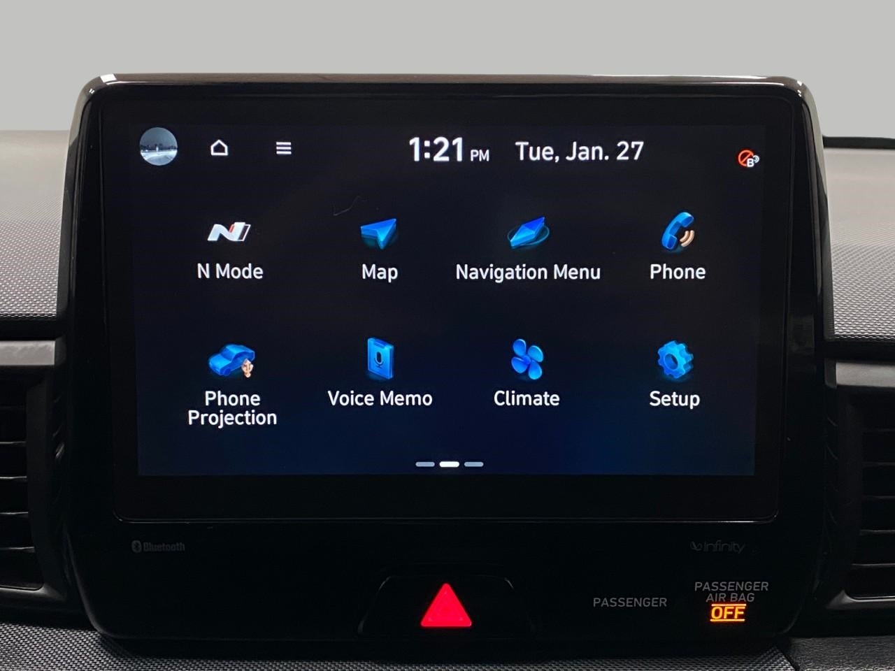 - Radio: AM/FM/HD/SiriusXM Infinity Premium Audio -inc: 8" display navigation 5.0, N specific menus, 8 speakers including subwoofer w/external amp, Bluetooth® hands-free phone system w/voice recognition, Apple CarPlay and Android Auto, dual charging USB ports (1 data and 2 power), speed-sensitive automatic volume control and Blue Link connected car system